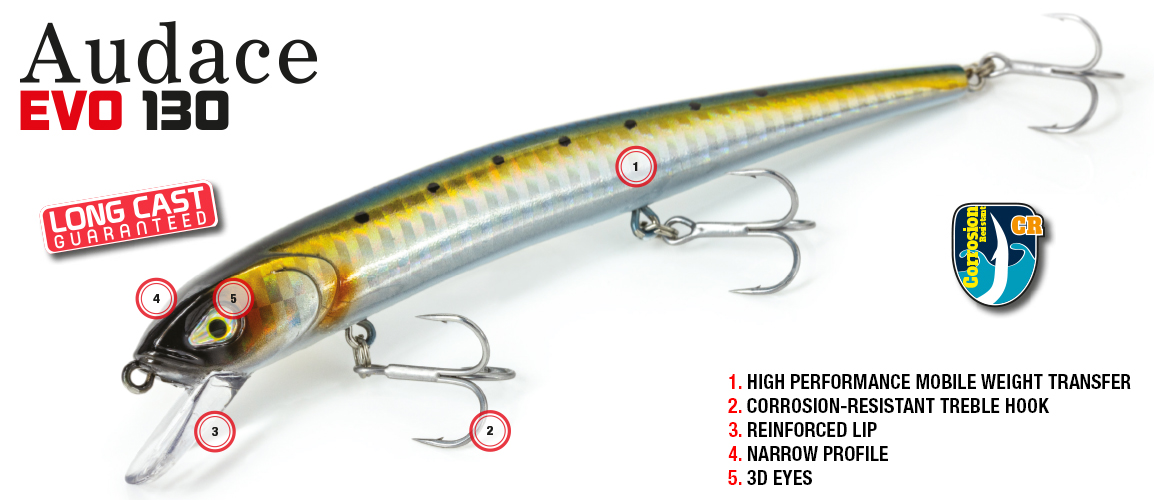 Grazie al suo design aerodinamico e a un sistema di bilanciamento interno ottimizzato, l’Audace Evo 130 assicura lanci lunghissimi e precisi, anche in condizioni di forte vento. La sua azione in acqua è semplicemente magica: un movimento “rolling” e “wobbling” marcato simula alla perfezione un pesce in difficoltà, innescando l’istinto predatorio dei grandi predatori.