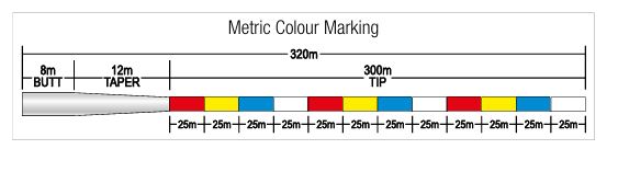 Inoltre, il segmento conico dell’estremità (lungo 20 m) funge da shock-leader, mentre il colore varia ogni 25 m, con lo shock leader trasparente.