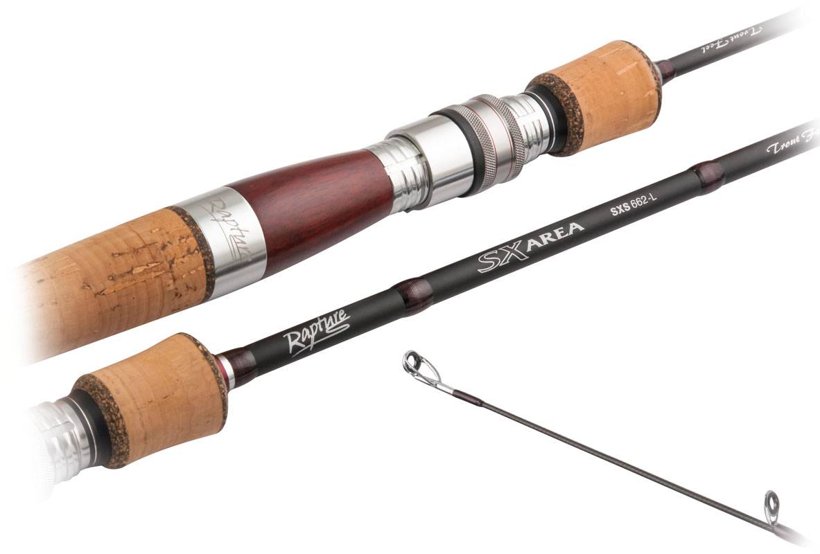 La serie di canne Trout Area di Rapture rappresenta il top di gamma dell’azienda. Caratterizzate da un fusto super sottile con tecnologia Super Slim Blank, vetta tubolare ad azione rapida Hyper Sensitive, porta mulinello in lega leggera e legno pregiato, e tappo in alluminio, queste canne sono dotate di anelli SIC a gambo singolo Sea Guide con telaio anti torsione.