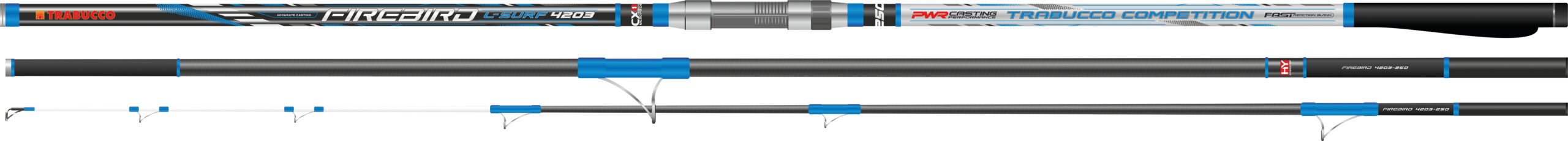 La nuova canna da surf casting in 3 pezzi Trabucco Firebird-L è progettata per gestire piombi fino a 250 grammi. Realizzata con grezzi in carbonio alto modulo CX-1 Micropitch, la parte finale della vetta è in carbonio pieno, inserito e incollato su parte tubolare (Hybrid Tip), con parte finale verniciata ad alta visibilità. Gli anelli Sea Guide SiC con design del telaio LC in acciaio inossidabile anti groviglio sono fissati con doppia legatura che sigilla i piedi contro l’intrusione di acqua salata. Il collare di tenuta in metallo è fissato sull’estremità superiore del calcio, con porta mulinello a vite in grafite e acciaio inox. L’impugnatura in gomma ergonomica offre un elevato controllo del lancio, mentre il tappo in alluminio e gomma para colpi garantisce comfort e sicurezza durante l’utilizzo.