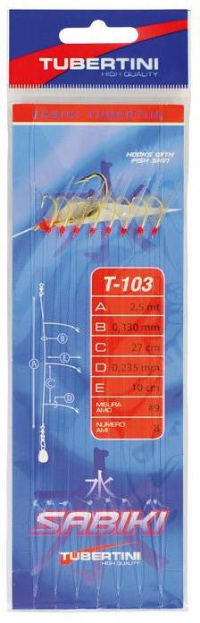 “Un classico sabiki per catturare piccoli sugarelli, sgombri, clupeidi e altre specie simili. Montato su lenze di vario diametro con speciali ami a gambo lungo e schiacciato, che grazie al profilo piatto impediscono alle prede di intaccare e tagliare le strisce di pelle di pesce con cui sono ornati, garantendo una migliore trattenuta e prevenendo danni all’apparato boccale. Il nodo sull’amo è rinforzato con un collante colorato a forma di pallina.