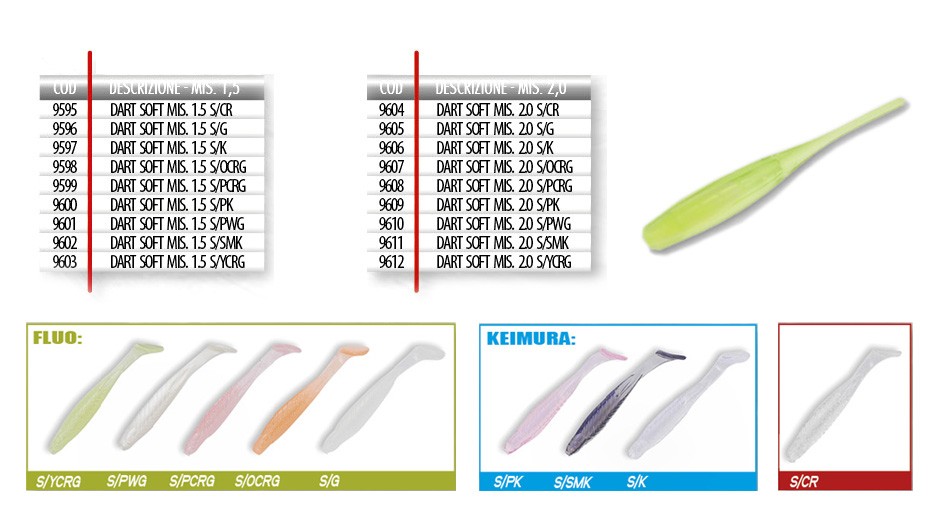 “Artificiale di alta qualità ideale per la pesca delle spigole in porti, scogliere e foci dei fiumi. Realizzato con silicone premium, è morbido e resistente. Le colorazioni trasparenti con anima interna colorata brillano intensamente in acqua. Si può montare direttamente con l’amo specifico in silicone proporzionato alla sua dimensione. Può essere utilizzato a galla con bulbi d’acqua o sul fondo con ami piombati o bombarde.”